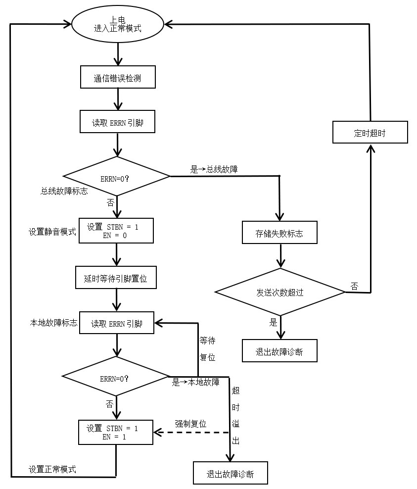 ECU節(jié)點上電啟動后SIT1043Q進入正常模式,在正常模式下MCU微控制器通過讀取引腳ERRN電平,來進行總線故障診斷。如果獲取到ERRN=0,則通信故障是由總線故障引起,MCU控制器置位總線故障通信失敗錯誤標志。如果獲取到ERRN=1,則控制器復位總線故障通信失敗錯誤標志。這時如果MCU控制器強制SIT1043Q進入到靜音模式,在靜音模式下,如果控制器獲取到ERRN=0,則可以診斷位本地故障。如果進一步獲取本地故障的哪一個類別(比如TXD顯性超時或總線顯性超時),可以由控制器操作RXD=0&TXD=1或者RXD=1進一步識別。
