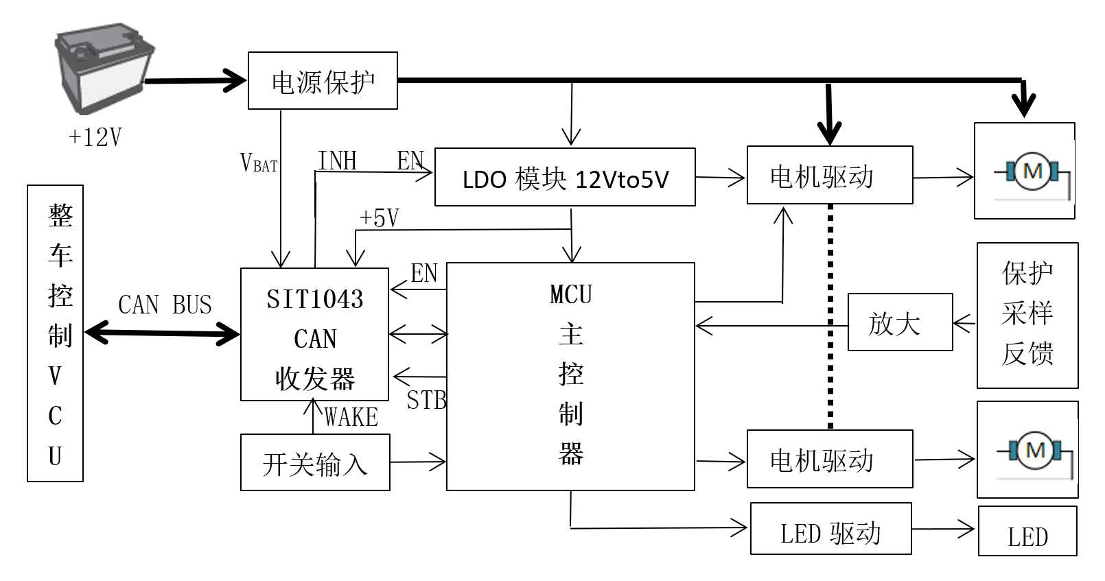ECU最常見的有:EMS(Engine Mangement System)發(fā)動機管理系統(tǒng),TCU(Transmision Control Unit)自動變速箱控制單元,BCM(Body Control Module)車身控制模塊,ESP(Electronic Stability Program)車身電子穩(wěn)定控制系統(tǒng),BMS(Battery Management System)電池管理系統(tǒng),VCU(Vehicle Control Unit)整車控制器等。隨著ECU控制范圍已經(jīng)擴張到巡航控制、燈光控制 、安全氣囊控制 ,懸架控制 、燃油加熱控制、排氣控制、制動控制、EGR和增壓壓力控制等等。下面我們來介紹SIT1043Q在車門控制模塊中的應用。在汽車車門模塊設計中,其技術需求: