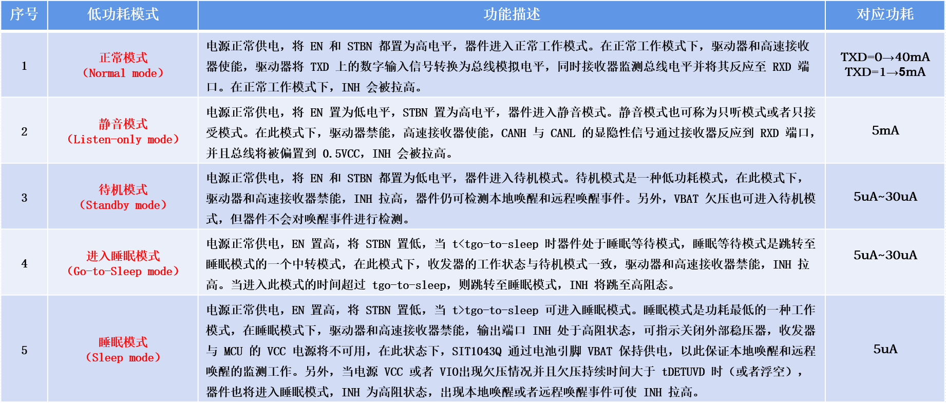 圖4:SIT1043Q五種低功耗模式及功耗