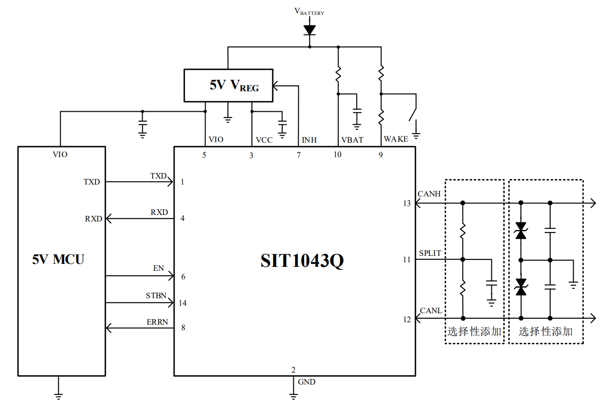 如果要求包含需要節(jié)點隨時待命(即使內(nèi)部VIO和VCC電源已關閉)的高速CAN網(wǎng)絡,尤其用于電池供電系統(tǒng),管理這些功能使SIT1043Q成為理想的選擇。