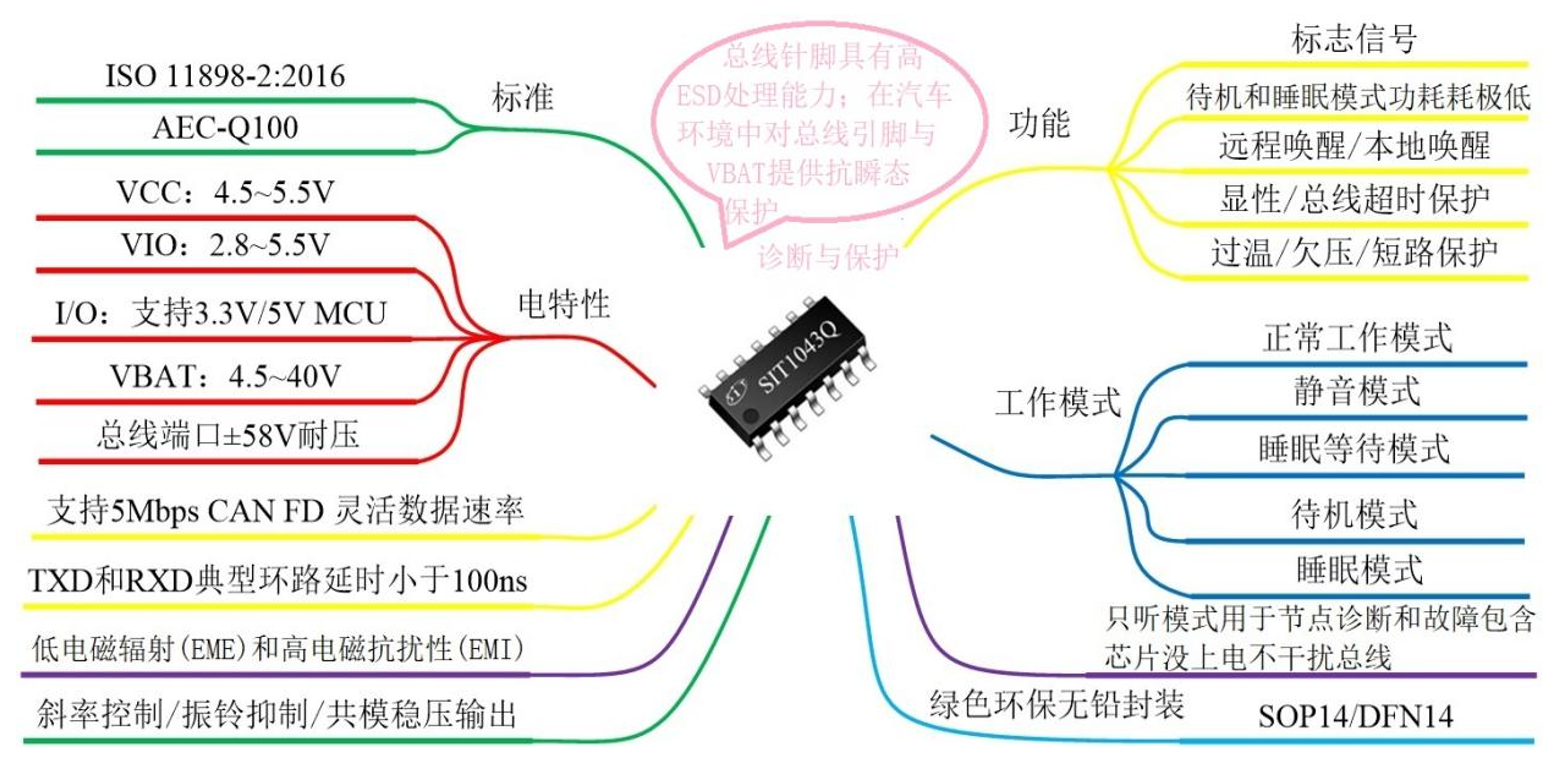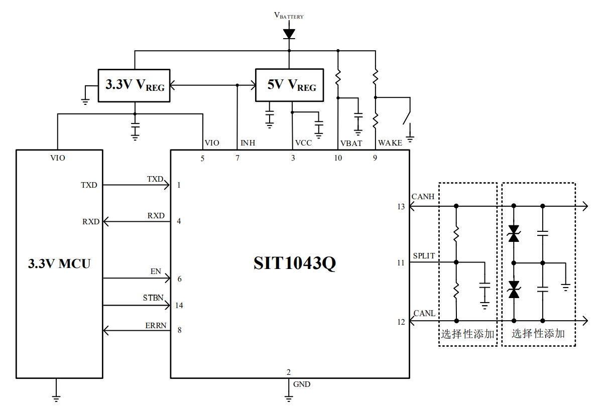 遠程喚醒:喚醒源來源于自身ECU節(jié)點所在的網(wǎng)絡報文,該節(jié)點可以處于完全睡眠狀態(tài),一般無能量消耗。這種喚醒的特點:只有當CAN收發(fā)器監(jiān)控到總線電平變化或者特定報文時,就會接通CAN芯片INH引腳控制LDO給到主控芯片上電,從而喚醒ECU節(jié)點。芯力特公司的SIT1043Q CAN收發(fā)器兼容以上兩種喚醒功能,下面我們來對SIT1043Q做個簡單的介紹。