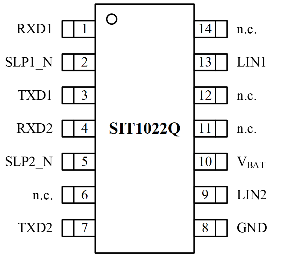SIT1022Q是一款雙通道本地互聯(lián)網(wǎng)絡(luò)(LIN)物理層收發(fā)器,符合LIN 2.0、LIN 2.1、LIN 2.2、LIN 2.2A、ISO 17987-4:2016 (12V) 和SAE J2602標(biāo)準(zhǔn)。主要適用于使用1kbps至20kbps傳輸速率的車載網(wǎng)絡(luò)。SIT1022Q通過TXDx引腳控制 LINx總線的狀態(tài),可將協(xié)議控制器的發(fā)送數(shù)據(jù)流轉(zhuǎn)換為具有最佳壓擺率和波形整形的總線信號(hào),以最大程度地減少電磁輻射發(fā)射(EME)。LIN總線輸出引腳具有內(nèi)部上拉電阻,僅當(dāng)用作主機(jī)節(jié)點(diǎn)時(shí),才需將LIN總線端口通過一個(gè)與二極管串聯(lián)的外部電阻上拉至VBAT。SIT1022Q通過LINx引腳接收總線上的數(shù)據(jù)流,并由接收器的輸出引腳RXDx將數(shù)據(jù)傳送到外部的微控制器。